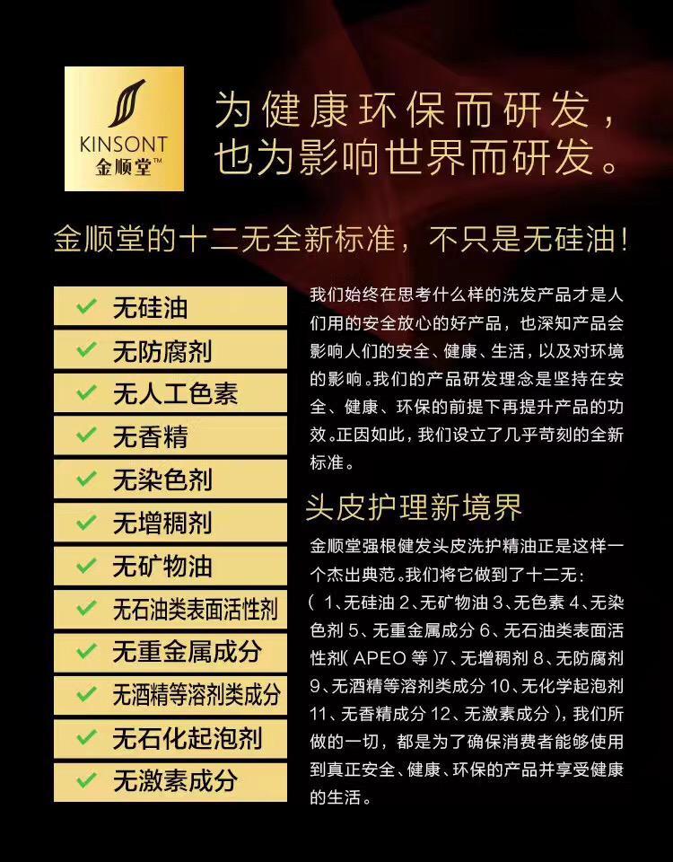 金顺堂强根健发头皮洗护精油郑重承诺不含以下成分:硅油、防腐剂、色素、增稠剂、起泡剂、香精。是全球唯一一款12无洗发产品: